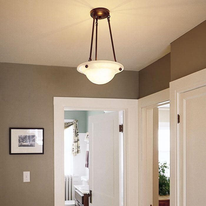 Made of authentic natural alabaster, our Larkspur™ Pendant Light provides beautiful, soft illumination for bedrooms, hallways, and other smaller spaces. This photograph illustrates the harmonious use of multiple small scale alabaster pendants down a hallway. The lights feature our highly Polished Brass fittings which coordinate with the door hardware, adding a spark of warmth to this crisp interior.