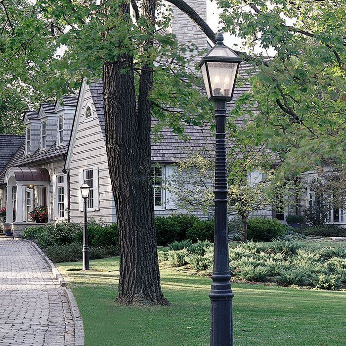The cobblestone driveway and front yard of a classic American suburban home on Chicago‘s north shore is tastefully illuminated with our large scale London Lantern 12 inch Wide Exterior Post Lights mounted to extra tall posts. The New Traditional Colonial Revival home has many historic details including a fanlight window, several dormer windows, double hung multi-paned windows with shutters, cedar wall cladding, and a copper roofed front entrance portico. The style and scale of the post mounted lanterns complement the traditional architecture of the home. Made to order in Milwaukee, the London Lantern has a four-sided skylight roof and glass walls which allow for supreme illumination from the three-light candelabra cluster. Sophisticated, but never fussy, our smart exterior London Lanterns are available in wall mount, ceiling mount, post mount, and pier mount styles for easy coordination around the outside of your home, garage, porch, patio, garden, and yard.
