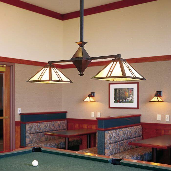 The interior designers for the student lounge of a Midwestern state college chose our Prairie Style inspired Mission Lantern Two Light Diamond Chandelier as decorative and functional pool table lighting. The handcrafted made in Milwaukee pool table light is built of solid brass components and sturdily designed to stay level. Shown in rich Architectural Bronze finish with warm Gold White Iridescent art glass panels and MIAD decorative overlay, this classic pool table light will always be in style. Shown in the background are coordinating Mission Lantern 8 inch Wide Straight Arm Sconces with the lantern shades mounted down warmly lighting the booths.
