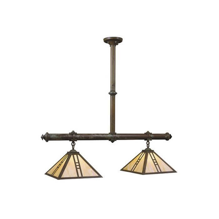 The rough-hewn qualities of our Mission Lantern Two Light Pendant Chandelier are an excellent complement to log house construction on other rustic settings. This hand-made fixture also provides the mass and scale needed for modern Arts & Crafts and Prairie Style interiors. This elegantly rustic chandelier is suitable for larger scale dining tables and kitchen islands. It makes a compelling statement over conference tables and library reading tables. The Mission Lantern Chandelier is also available in a Three Light version. Choose from six authentic Metal Finishes, nine American art Glass Panel colors, and six Overlay options to suit your unique décor.