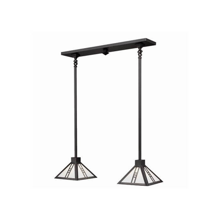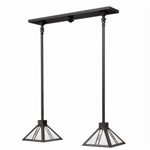 Our handcrafted Mission Two Light Solid Stem Chandelier is a period inspired fixture suitable for kitchen islands, narrow dining tables, breakfast nooks, and home pubs and bars. This high quality light is beautiful in Mission, Bungalow, Craftsman, Arts & Crafts, and Prairie Style interiors. A diamond chain link to link connection connects the rectangular mounting plate to the square stems. The pyramidal 8 inch wide shades have range of decorative Overlay, metal finishes, and art glass panels choices, making it easy for you to customize the fixture to your interior. The made in Milwaukee two-light chandelier is made to order in the best Overall Length for your ceiling height. If you need assistance choosing metal finishes, art glass panel colors, or determining the best Overall Length for your Mission Two-Light Chandelier, please contact our sales team for experienced lighting design advice.