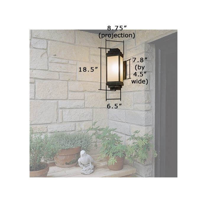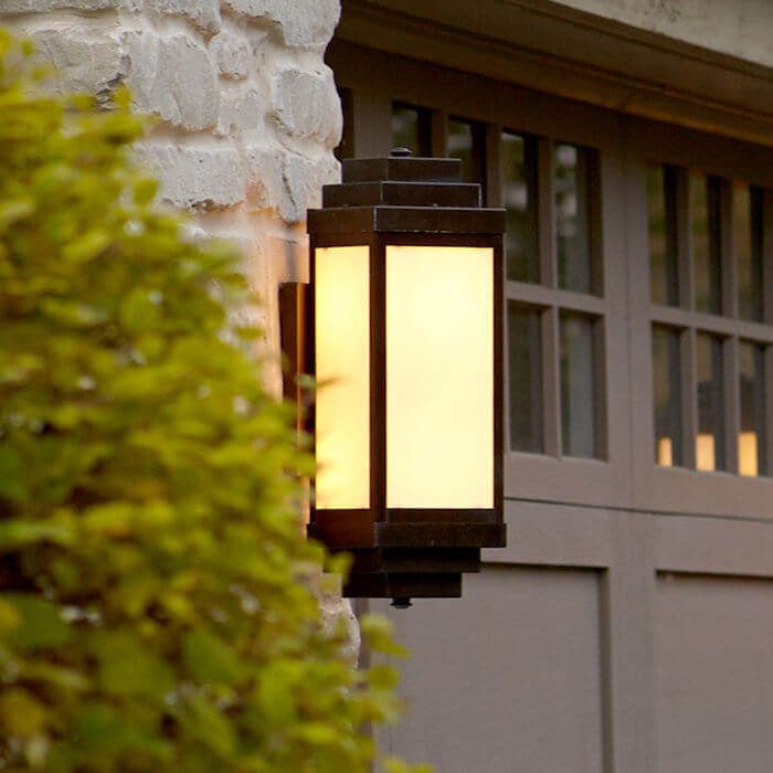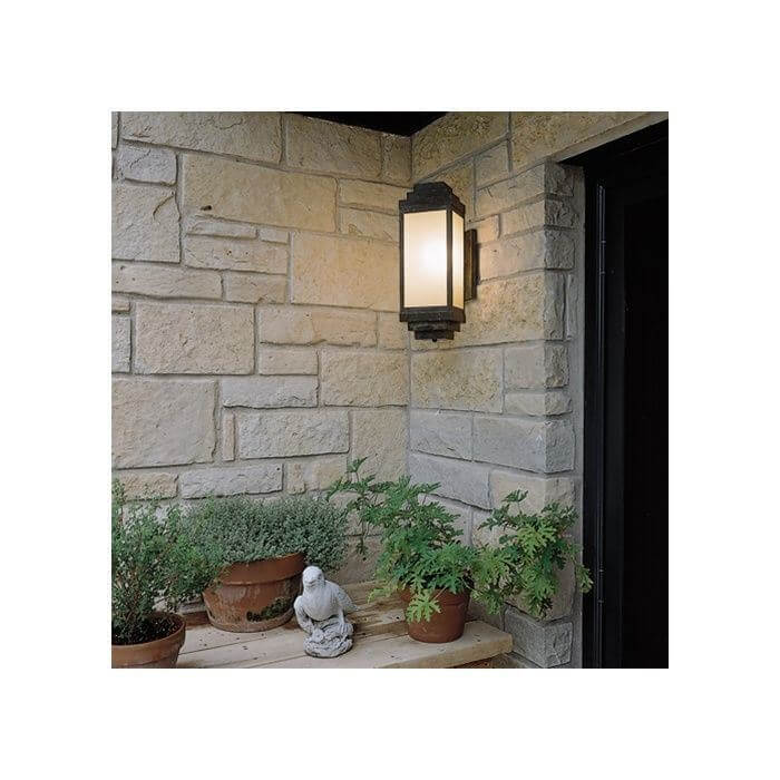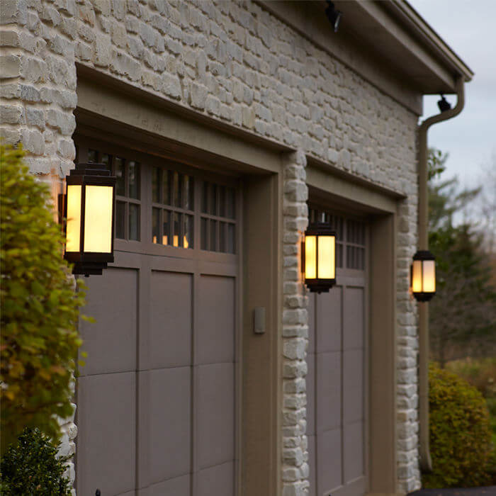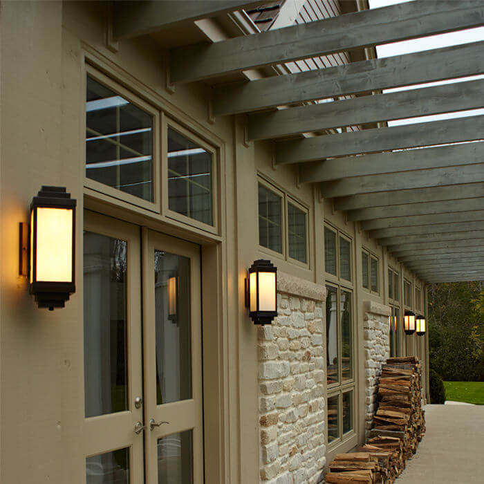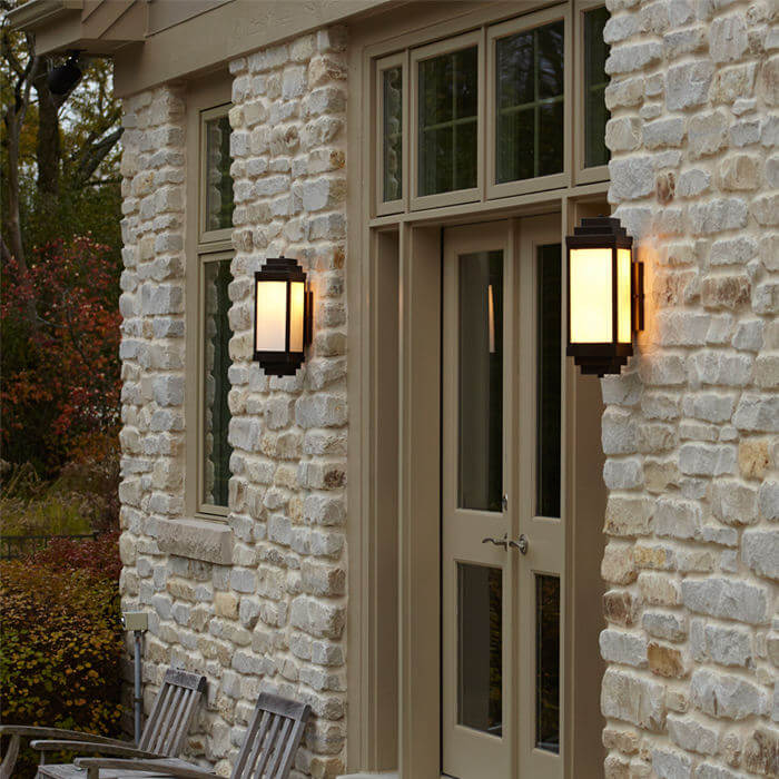 Nothing adds warmth to an impressive home like architecturally appropriate light fixtures. The architect of the contemporary Adirondack home pictured chose our sophisticated outdoor sconce the Montara Lantern 6″ Wide Flush Exterior Wall Light to flank the French doors of this exceptional American home. Crisply detailed, the Art Deco influenced design of this exemplary exterior light means it works equally well on contemporary and traditional buildings and on a variety of exterior wall styles such as brick, stone, cedar, or painted wood siding. The diagonal mounting allows for ample light to project from four sides of the lantern providing plenty of light for outdoor entertaining under the post and beam pergola. The Montara Lantern pictured is shown in rich Architectural Bronze metal finish with warm Cream art glass panels and No Overlay. This exterior wall sconce is also available in a Tall version and with Double Bar Overly. Please contact our sales department if you need help determining the perfect combination of options for your project.