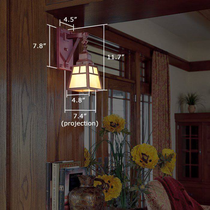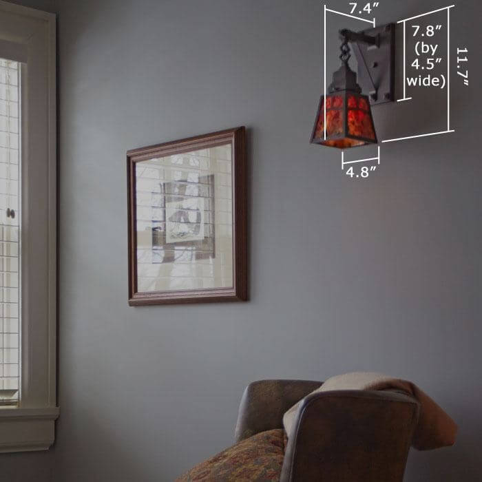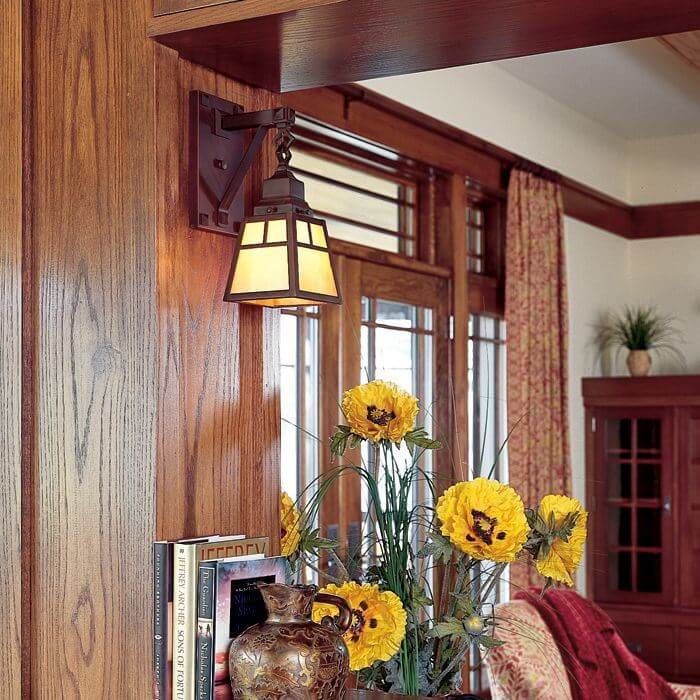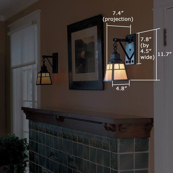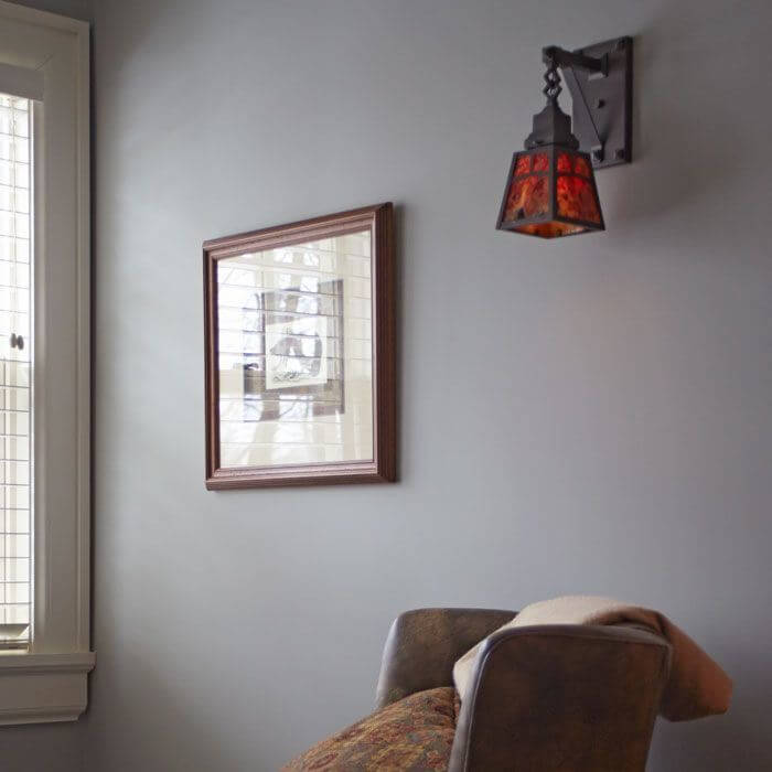 Two Nashota™ One Light Chain Link Sconces with 2-1/4″ shade holders, shown in Architectural Bronze finish with Window Pane shades, are mounted above the original oak mantle of the tiled Arts & Crafts fireplace shown above. These lights are a modern interpretation of the traditional English Arts & Crafts fixture and are a good fit for period interiors. Over the years, our customers have installed this rustic wall sconce in stairwells, foyers and hallways for warm, classic illumination in their period homes.
