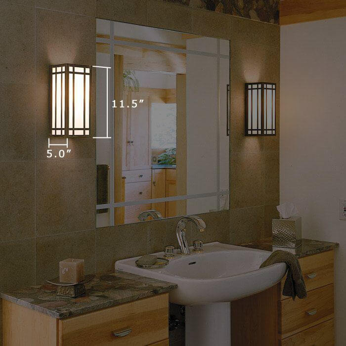 Shown above is a close up view of our handcrafted Studio Lantern 6 inch Wide Sconce without Roof. The made in Milwaukee indoor sconce has an open top and bottom to allow for maximum ambient illumination, adding beautiful ambient light and architectural focus to any interior. The medium scale linear indoor sconces are popular for entryways, corridors, stairwells, bathrooms and over fireplaces. The Studio Lantern is shown in rich Architectural Bronze metal finish with warm Gold White Iridescent art glass panels and charming Macintosh decorative overlay. As with all our indoor lantern sconces, there is a choice of 6 high quality metal finishes, 9 art glass panel colors, and 4 decorative overlay options so you can tailor the light to complement your interior. If you have questions regarding the best metal finish, art glass, or scale of lantern for your project, please contact our sales team for lighting design expertise.