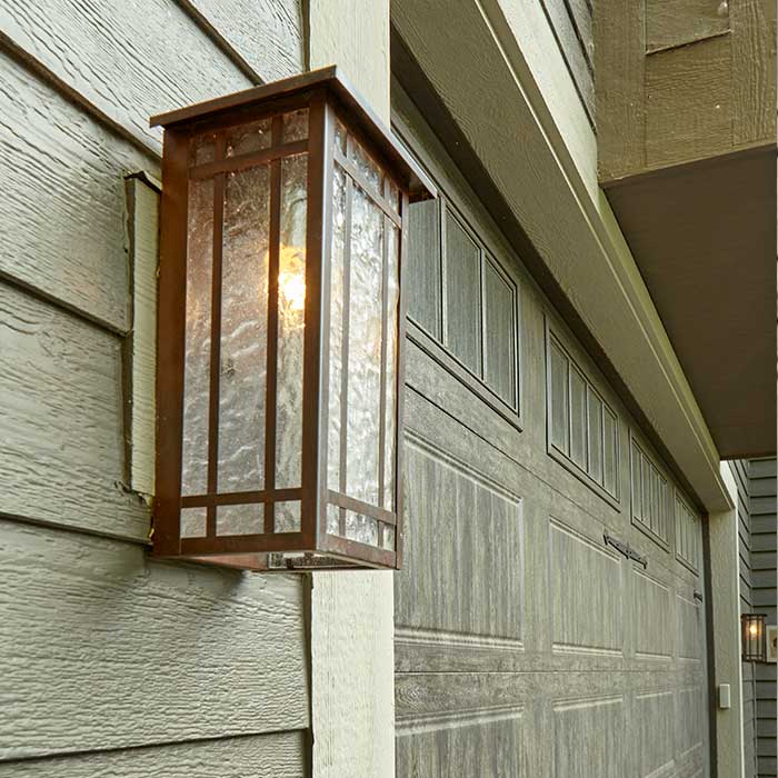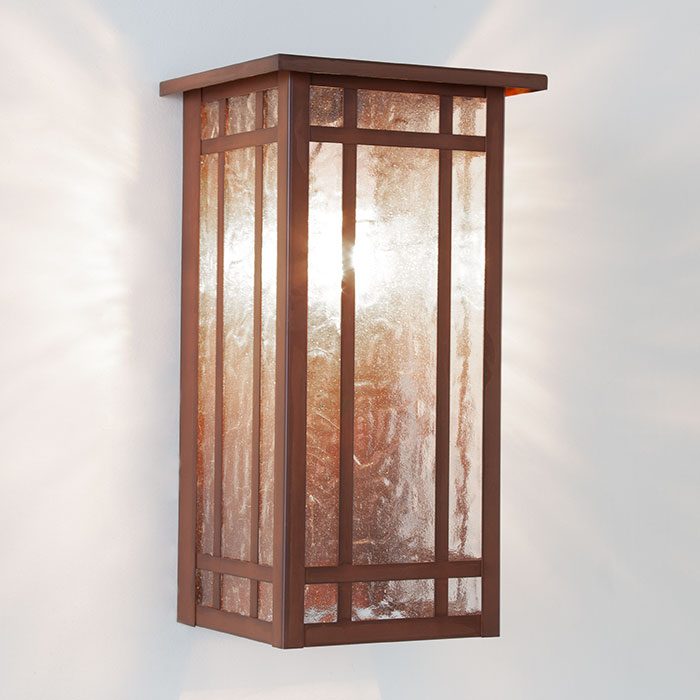 Shown above is our Studio Lantern 7 inch Wide Flush Mount Interior/Exterior Wall Light with Roof. The streamlined design of the linear sconce is inspired by Asian and Prairie School influences. Shown in rich Architectural Bronze finish with clean Sandblast Frost art glass panels and Prairie decorative Overlay, the handcrafted made in Milwaukee Studio Lantern is at home both indoors and out. Tailor the Studio Lantern to suit your interior or exterior location by choosing from 6 high quality metal finishes, 9 art glass panel options, and 3 decorative Overlays. For a more modern look for mid-century and ranch style homes, choose the No Overlay option. If you have questions regarding the best design for your Studio Lantern, please contact our sales team for helpful lighting tips.