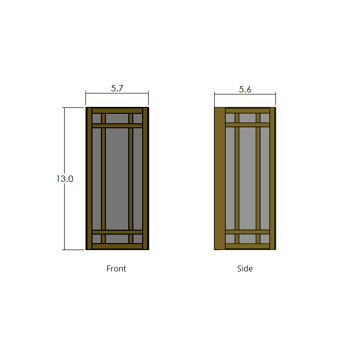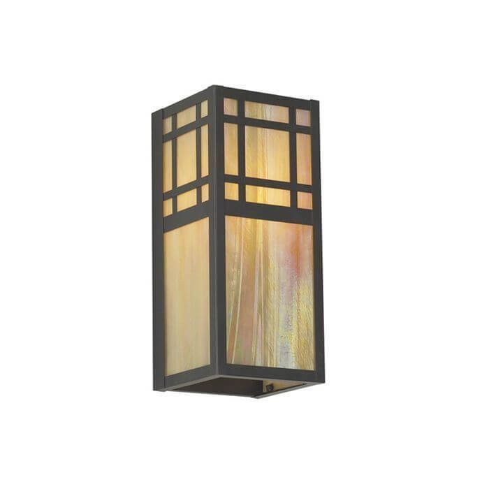 Shown above is a close up view of our handcrafted Studio Lantern 7 inch Wide Sconce without Roof. The made in Milwaukee indoor sconce has an open top and bottom to allow for maximum ambient illumination, adding beautiful ambient light and architectural focus to any interior. The medium scale linear indoor sconces are popular for entryways, corridors, stairwells, bathrooms and over fireplaces. The Studio Lantern is shown in rich Architectural Bronze metal finish with warm Gold White Iridescent art glass panels and charming Macintosh decorative overlay. As with all our indoor lantern sconces, there is a choice of 6 high quality metal finishes, 9 art glass panel colors, and 4 decorative overlay options so you can tailor the light to complement your interior. If you have questions regarding the best metal finish, art glass, or scale of lantern for your project, please contact our sales team for lighting design expertise.