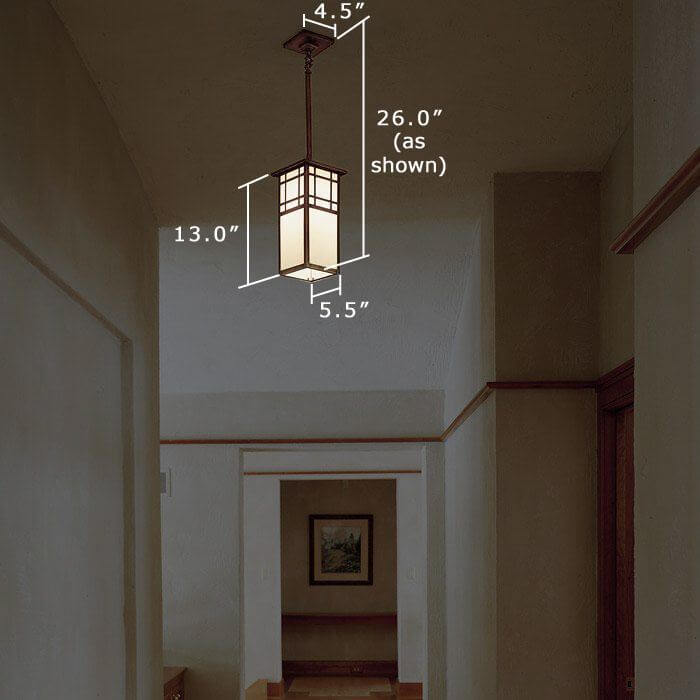 A recently built contemporary home has a long first floor corridor with picture frame moldings and tall ceilings. The generous proportions of the interior design called for a bold light fixture with a vertical emphasis. The architect opted for our handcrafted made in Milwaukee Studio Lantern 7 inch Wide Solid Stem Pendant Light. The rich Architectural Bronze finish of the ceiling mounted lantern provides rich contrast to the neutral palette of the corridor. The light fixture has clean White Opal art glass panels for a bright light and direct down lighting through the open bottom. Macintosh Overlay on the art glass panels adds interest and complements the lines of the hallway. The Overall Length was determined by ceiling height ““ and the bottom of the lantern falls just above the picture frame molding. This straightforward modern style medium scale indoor lantern pendant is available in 6 different metal finishes, with 9 art glass options, and 4 Overlay choices ““ making it possible for you to tailor your Studio Lantern Stem Pendant to perfectly fit the inside of your home, no matter the ceiling height, palette, or architectural style. Do you need help determining the best sized lantern for your hallway, foyer, stairwell, or front entrance? Please contact our sales team for expert advice before ordering.
