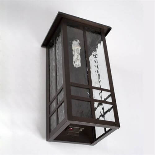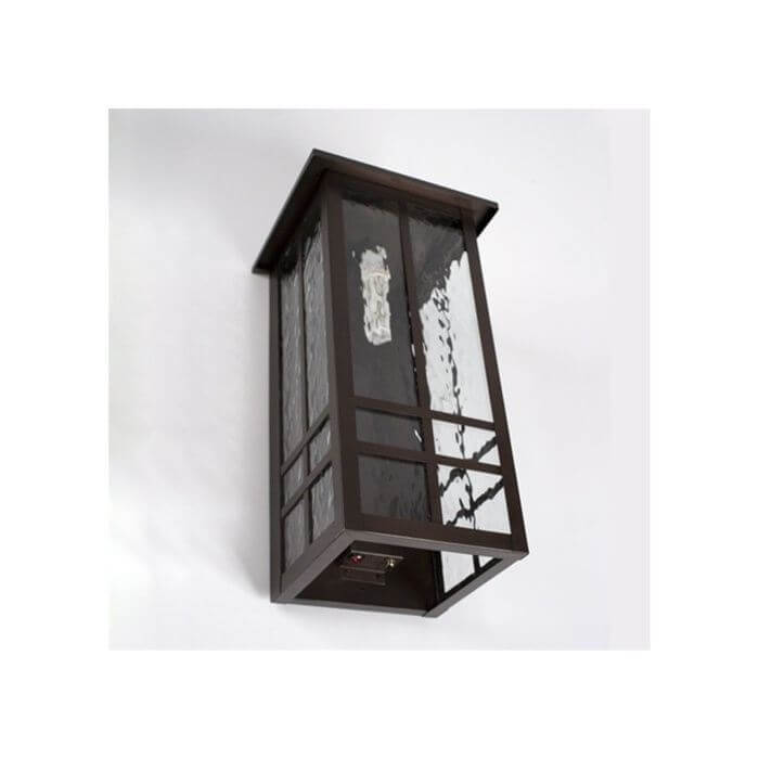 The handsome flush mount outdoor sconces are shown in rich Architectural Bronze metal finish with clean Waterfall art glass panels and Prairie Overlay. Because our lighting sales team, engineers, and craftspeople are all located in one large plant in Milwaukee, we have the ability to oversee custom lighting requests from start to finish. Over the years, custom requests have included IEB‘s, modification for compact fluorescent ballasts, specific decorative overlays to complement architectural details, special order glass panel choices, and even extra large versions of our sturdily built lanterns. If you have a custom question for your residence or commercial project, please contact our helpful sales team with the details. Minimum order quantity may apply for pricing.