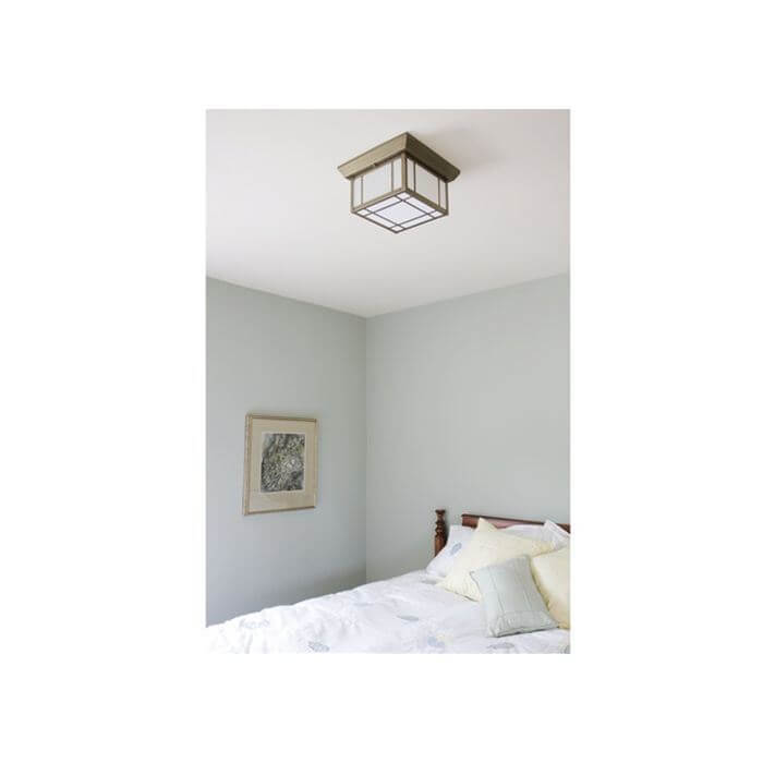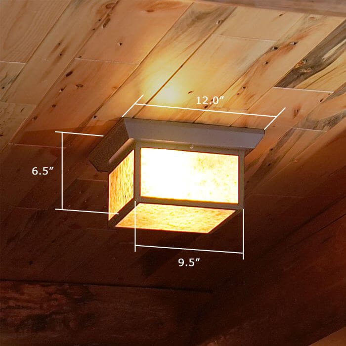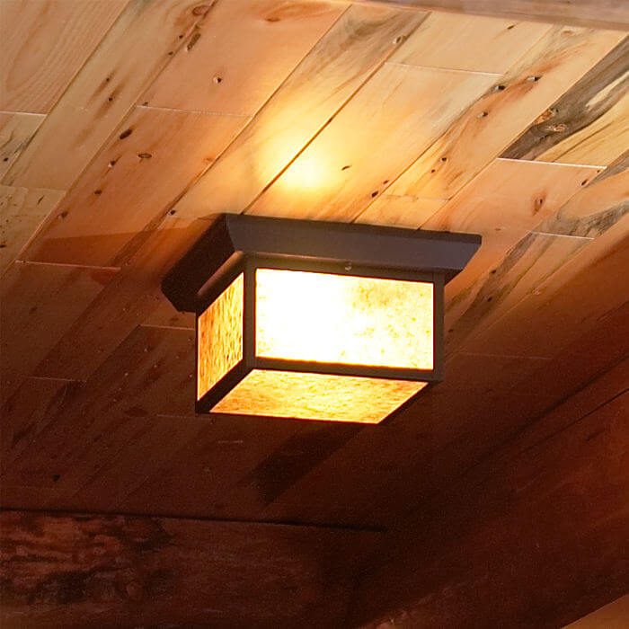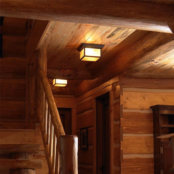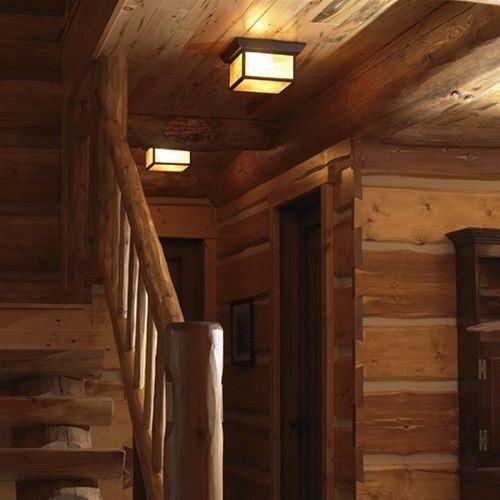 Shown lighting a rustic lower level of a custom log home, the Architectural Bronze finish and Natural Shale Mica of this rustic light fixture complements the tongue and groove ceiling. Choose the Small Rustic Hillside Ceiling Fixture for lighting smaller bedrooms, hallways, and vestibules.