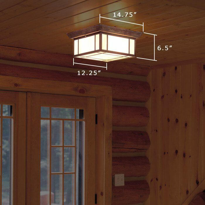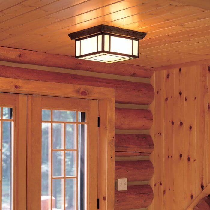 The New Traditional Arts & Crafts home shown above was built in the 1990‘s using Arts & Crafts design ideas from the 1890‘s to 1920‘s. Abundant use of reddish stained maple doors, columns, and crown moldings set the tone for the wide hallway leading from the front entrance. Balancing traditional architectural details with fresh updates resulted in a comfortable, modern home with a sense of history and a lot of personality. Several of our Hillside Lantern 12″ Wide Semi Flush Exterior Ceiling Lights provide attractive illumination for the front entry hall. Shown in Architectural Bronze with White Opal art glass panels, the square semi-flush ceiling lights are handcrafted in our Milwaukee plant of solid brass and American made glass. Choose from six high quality metal finish choices and nine art glass panel options. For a more streamlined, modern looking light fixture, please indicate No Overlay when you place your order.