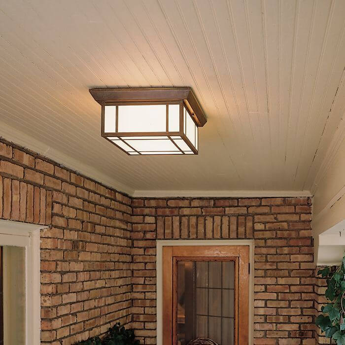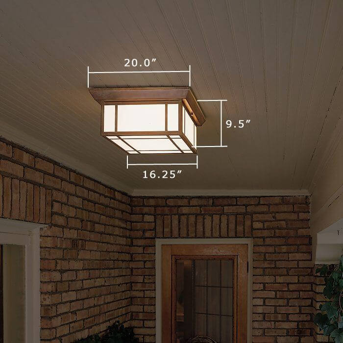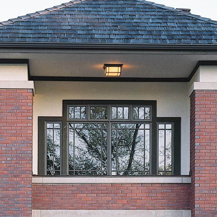 On the front porch, mounted to the bead board ceiling of an American suburban home is our prairie inspired Hillside™ Lantern 16″ Wide Semi Flush Exterior Ceiling Light. This outdoor ceiling fixture provides ample illumination and hardy architectural style. Shown is our largest Hillside Ceiling Fixture, but our 12 inch wide and 10 inch wide versions are popular for smaller porches or for outdoor areas where ceiling height is limited. This outdoor light is available with the Foursquare Overlay as shown, or for a very clean, minimalist look, with No Overlay. Further tailor this ceiling light to fit your home by choosing from 8 Art Glass Panel options and 7 high quality metal finishes.