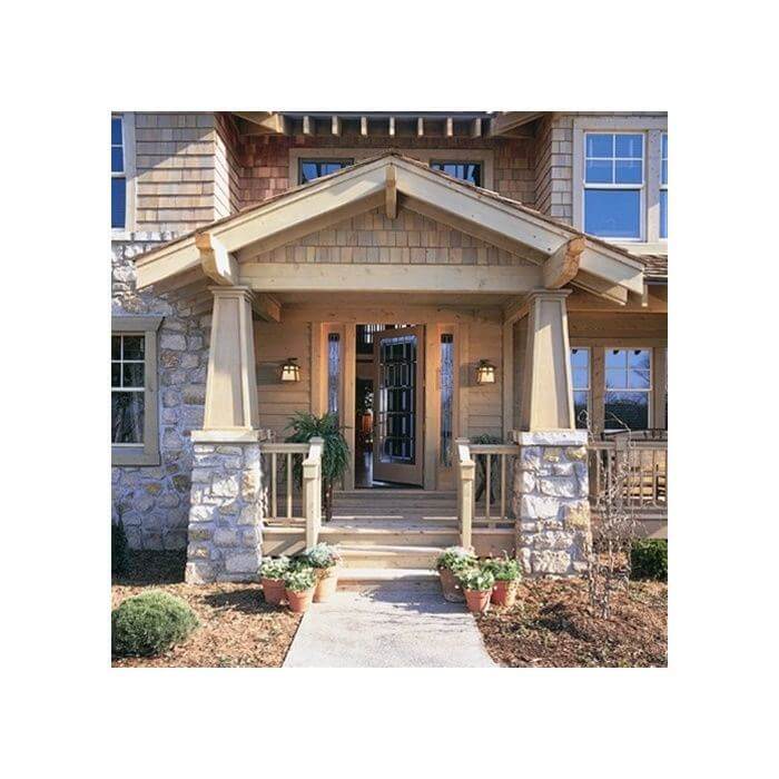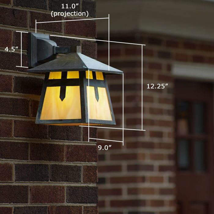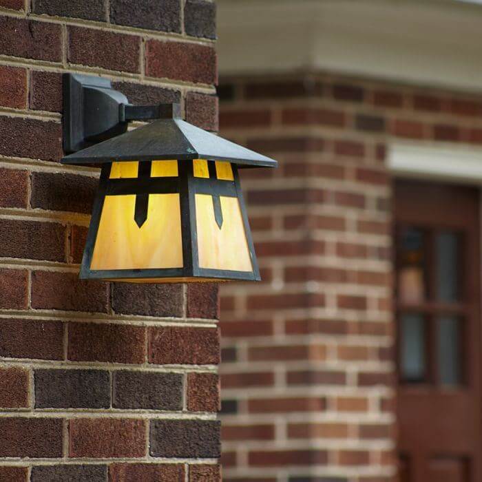The exterior sconce pictured on the American Bungalow above is our Arts & Crafts inspired Stamford Lantern. Good workmanship and high quality materials were important to Craftsman builders and designers and these qualities are reflected in this classic American, beautifully proportioned lantern. Shown in genuine Verdigris Patina paired with Gold White Iridescent Art Glass Panels and mounted to the walls of a red brick porch, this handmade lantern adds warmth and grace to a beautifully preserved home.