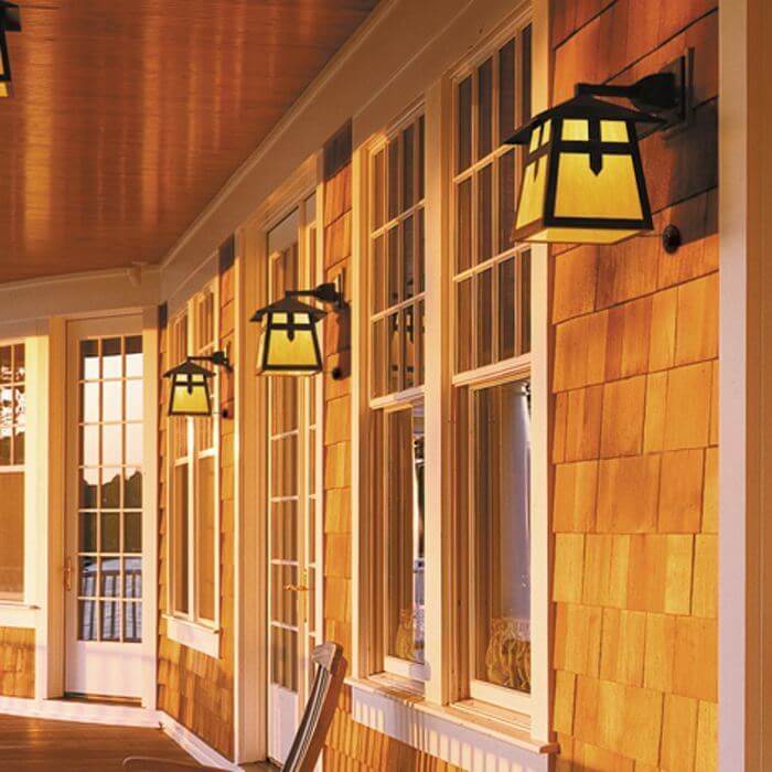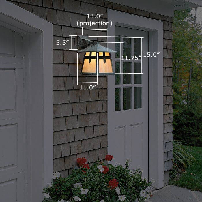 Shown in our high quality Verdigris Patina finish with Gold White Art Glass Panels, the Stamford Lantern is true to its Arts & Crafts roots, fitting easily in this natural Shingle Style garage entry setting. Carefully made with the most durable materials in our Milwaukee, Wisconsin production facility, every Stamford Lantern is handcrafted by expert artisans and designed to withstand harsh elements and provide beautiful light for years to come. Reproduced from an original 1905 Arts & Crafts lantern, the beautifully proportioned 11 inch wide Stamford Lantern is one of our most popular exterior sconces for Shingle Style Lighting.