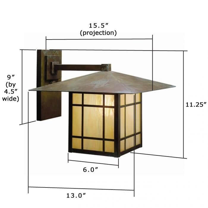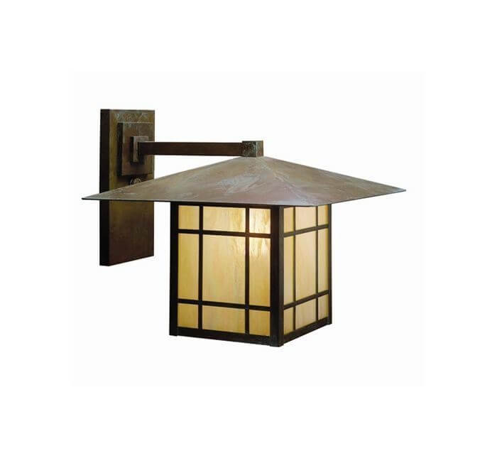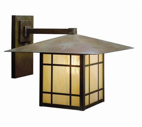 This striking outdoor lantern was inspired by Frank Lloyd Wright‘s early architecture, evident in the low pitched roofline and clean lines of the body. This Prairie style light fixture radiates classic American design and durable handmade, high quality construction. Over the years, our customers have ordered outdoor Prairie View Lantern outdoor wall sconces for front porches, covered verandas, terraces, garages, exterior walls and other locations where memorable, highly functional outdoor lighting is essential. The Prairie View Lantern pictured features Foursquare Overlay element over Gold White Iridescent art glass panels. Our genuine Verdigris Patina adds an organic touch of natural beauty to this strongly linear outdoor lantern.
