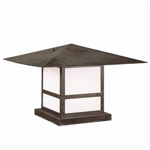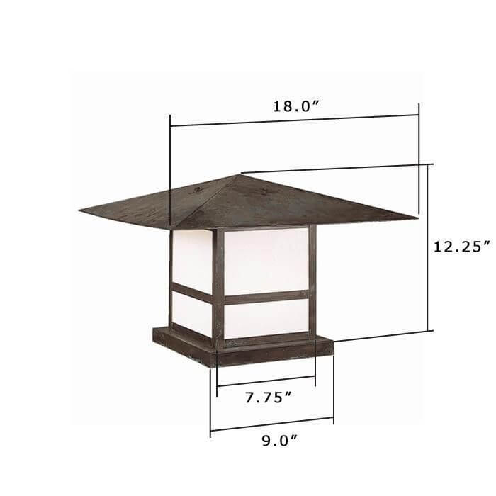 The striking profile of our handcrafted Prairie View Lantern 18 inch Wide Exterior Pier Light is inspired by early Frank Lloyd Wright Prairie Style architecture and Asian rooflines. The made in Milwaukee pier mount outdoor light is an eye-catching choice for front yards, driveway entrances, outdoor rooms, garden walls, and backyard patios. Shown in authentic Verdigris Patina metal finish with clean White Opal art glass panels, the sturdy pier/column lantern is made to order with a choice of six high quality metal finish options, nine art glass panel choices, and two historically inspired Overlays or with No Overlay. If you need help determining the best scale, metal finish or art glass panel choice, and Overlay option for your Prairie View Lantern, please contact our sales team for helpful lighting design suggestions.