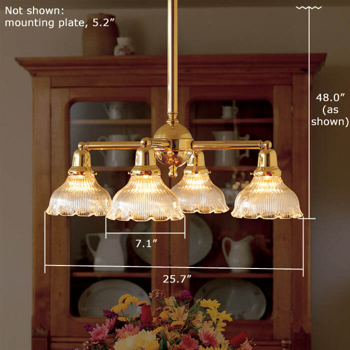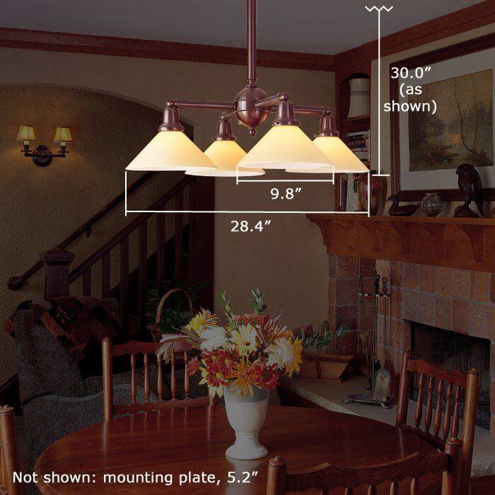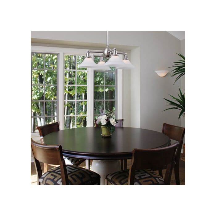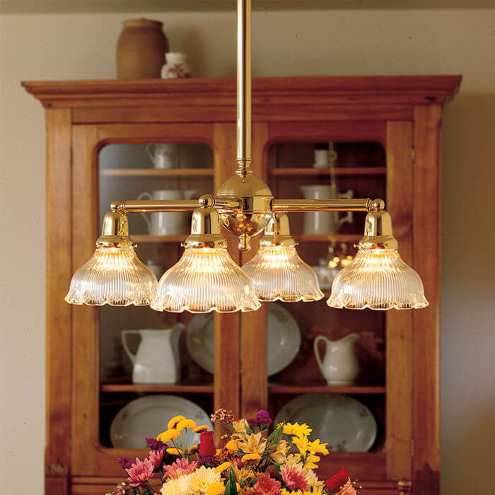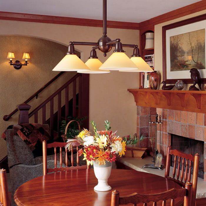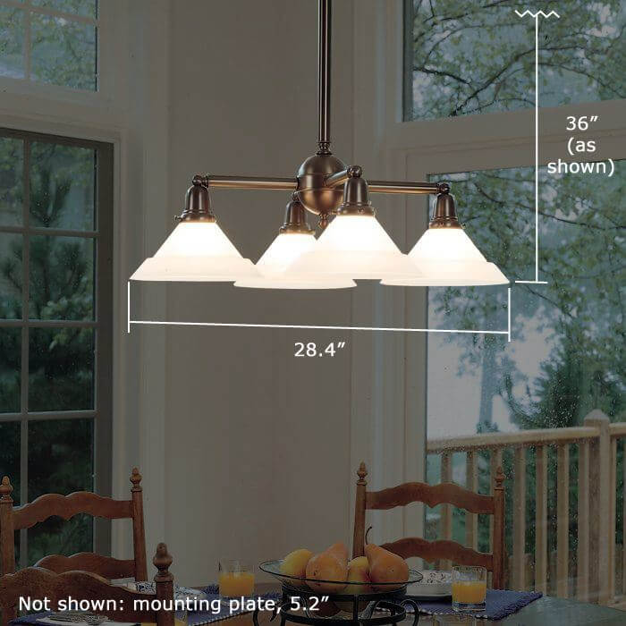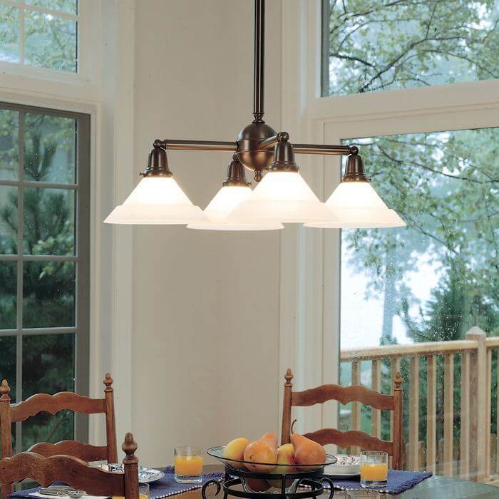 The kitchen of a recently remodeled Lake Cottage is lit with our classic Shoreland Four Light Chandelier with 2-1/4 inch shade holders. This classic style of chandelier is popular for dining tables and breakfast nooks for a variety of traditional interior styles including Shaker and Victorian. The clean lines of this fixture also make it suitable for contemporary interiors, especially when ordered in one of our high quality Nickel metal finishes or darker metal finishes such as Architectural Bronze and Architectural Iron. Shown here in rich Architectural Bronze with our exclusive 10 inch Opal Satine Stepped Cone Shade, the Shoreland Four Light Chandelier fits in with the elegantly casual décor of this Lake Cottage kitchen.