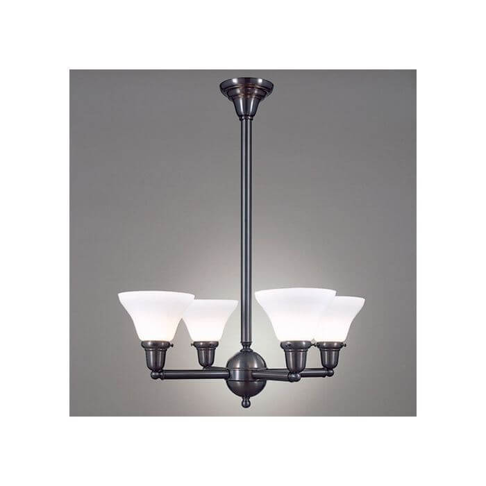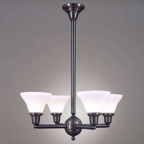 The handcrafted Shoreland Four Light Chandelier with 2-1/4 inch shade holders facing up is a fantastic choice to illuminate dining tables, kitchen tables, and moderately sized rooms. Our customers also like this made in Milwaukee light fixture for stairwells and foyers and entryways with tall ceilings. Order the Shoreland Four Light Chandelier with in the best Overall Length, based on your ceiling height. Straightforward, classic design elements ensure the ceiling light works well with a number of interior design styles including Transitional, Contemporary, Cottage Style, Traditional, American Foursquare, Adirondack, Arts & Crafts, American Bungalow, and Rustic. One of our most popular chandeliers due to affordability, quality, and style, the Shoreland Four Light Chandelier can be tailored to suit your room by choosing from our 13 high quality metal finishes and array of shade options. For assistance choosing the best metal finish, Overall Length, and shade for your chandelier; please contact our sales team for helpful lighting design ideas and tips.