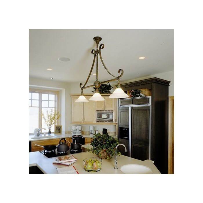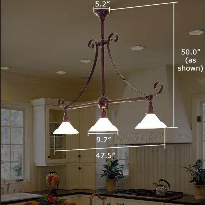 This three-light chandelier is a splendid touch to the French Country Style custom kitchen shown. Perfectly proportioned and suspended over a large granite island, the hand-bent scrolls are expertly bent in our Milwaukee studio to coincide with the light fixture’s overall length. Designed for lighting kitchen islands, this French Country light fixture is also a good choice for illuminating rectangular kitchen and dining room tables and breakfast nooks. Over the years, commercial customers have ordered this eye-catching light fixture to add a touch of old-world charm to lounges, bistros, and pubs.