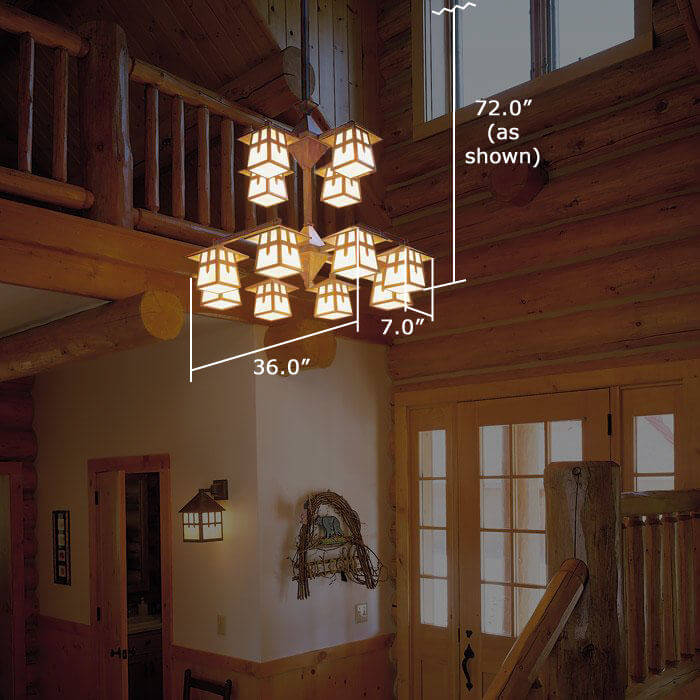 A large two story foyer in a rustic log cabin home is beautifully lit with our handcrafted rustic style Stamford Lantern Twelve Light Two Tier Diamond Chandelier. The made in Milwaukee large scale chandelier fills the tall front entry space with pleasant light, highlighting the hand hewn peeled log walls and loft railing. The lantern chandelier also provides architectural visual focus and plentiful downward lighting. The two-tiered chandelier was ordered in a 72 inch Overall Length to accommodate the high placement of the electrical box in the peak of the northwoods log home. The substantially sized chandelier is shown in natural authentic Verdigris Patina metal finish with bright White Opal art glass panels in the 6 inch wide by 8 inch tall Stamford lanterns. Mounted to the wall below is a Bungalow Lantern 8 inch Wide Straight Arm Exterior Wall Light also in Verdigris Patina with White Opal art glass panels providing additional illumination to the grand entrance. The light fixtures shown above are marvelous in mountain homes, western homes, lodges, haciendas, A-Frames, and large Arts & Crafts and Mission Style homes with tall entryways.