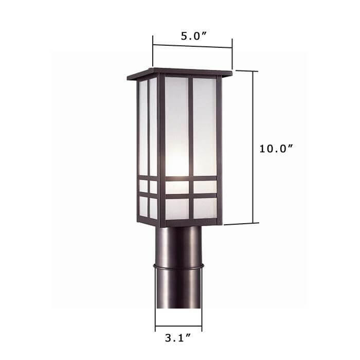 Our Studio Lantern 5″ Wide Exterior Post Light is a great choice for path lighting along gardens, paths, sidewalks, and front steps. Pair our larger Studio Lantern sizes on our solid brass posts for attractive lighting in front yards, along walkways, and to flank driveway entrances. Tasteful and clean, this classic American outdoor light is influenced by Prairie Style architecture and, depending on the Overlay choice, works well with a number of architectural styles including Prairie Style, Mid-Century Modern and Contemporary. The post mounted path light lantern pictured is shown in Architectural Bronze metal finish with Sandblast Frost glass panels and Prairie Overlay. Made in America, this outdoor lantern is constructed of heavy duty brass and will brighten your pathway for years to come.