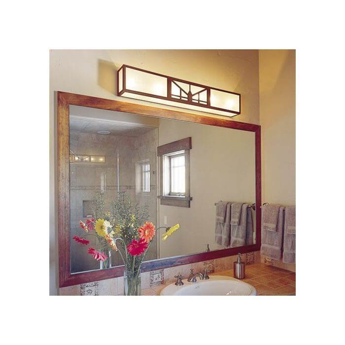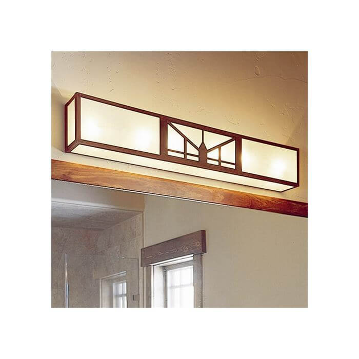Our handmade Sunrise Lantern 35 inch Wide Bath Bar provides handsome over the mirror illumination for the master bathroom shown above. Our customer chose warm Antique Copper metal finish with modern Sandblast Frost art glass to complement the contemporary Western flair of the master bath. Prairie School architects often created elaborate designs for stained glass windows and light fixtures inspired by forms in nature. We use variations of a stylized sunrise pattern to create handsome wall mounted bath bar light. Made in Milwaukee, the bathroom light is constructed of solid brass and art glass panels. Choose from 6 metal finishes and 9 art glass options for the Sunrise Lantern. If you have questions regarding the best metal finish, art glass, or scale of bath bar for your project, please contact our sales team for helpful lighting tips.