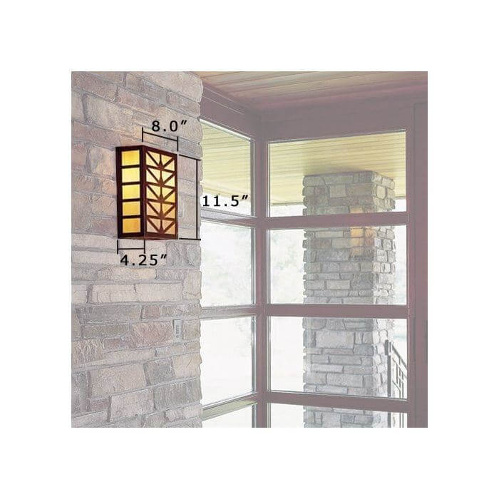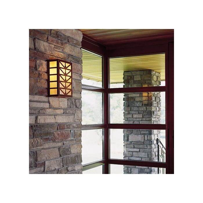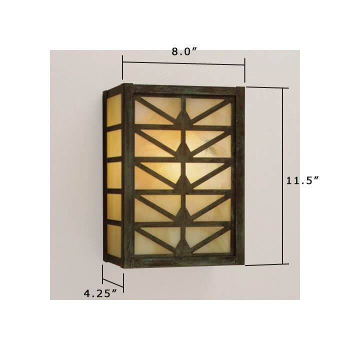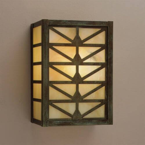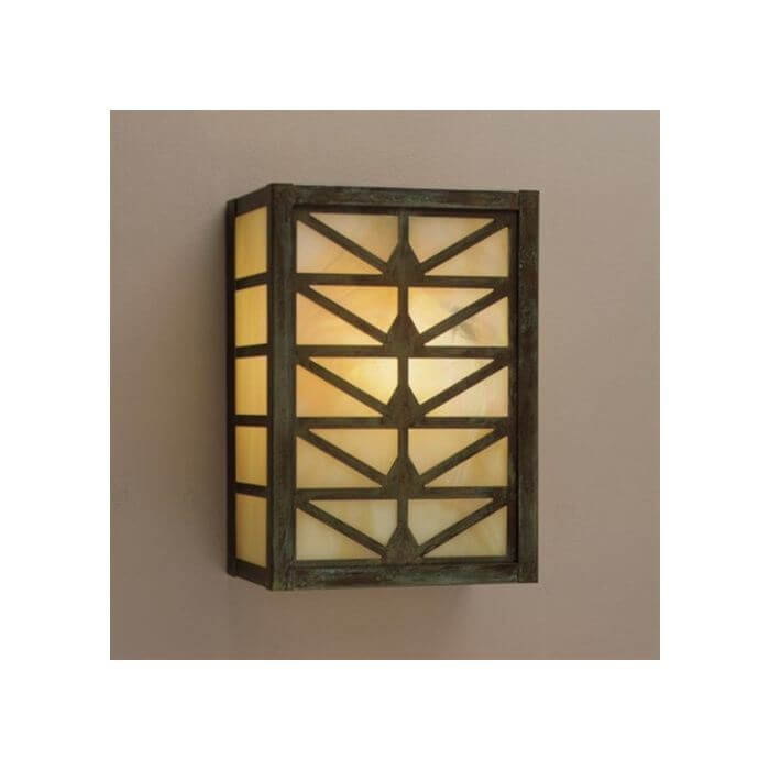 Prairie School architects often created elaborate designs for stained glass windows and light fixtures inspired by forms in nature. We use variations of a stylized sunrise pattern to create handsome wall mounted lanterns suitable for a variety of indoor locations. Shown above is our handcrafted made in Milwaukee Sunrise Center Lantern 9 inch Wide Sconce without Roof with authentic Verdigris Patina metal finish and warm Gold White Iridescent art glass panels. Customers have ordered these charismatic solid brass Prairie Style indoor/outdoor light fixtures for rustic homes and cabins, Craftsman Bungalows, Frank Lloyd Wright influenced residences, and to enliven commercial projects that require compact fluorescent lighting. The slim profile makes this lantern sconce a good fit for vestibules, hallways and corridors, powder rooms, mud rooms, recreation and family rooms, stairwells, and any location that needs interesting, high quality decorative lighting with exceptional illumination. This sconce may be modified for ADA compliance. Our made-to-order Sunrise Center Lanterns are available in three sizes. If you have questions regarding the best scale lantern for your project, please contact our sales team for helpful lighting tips.