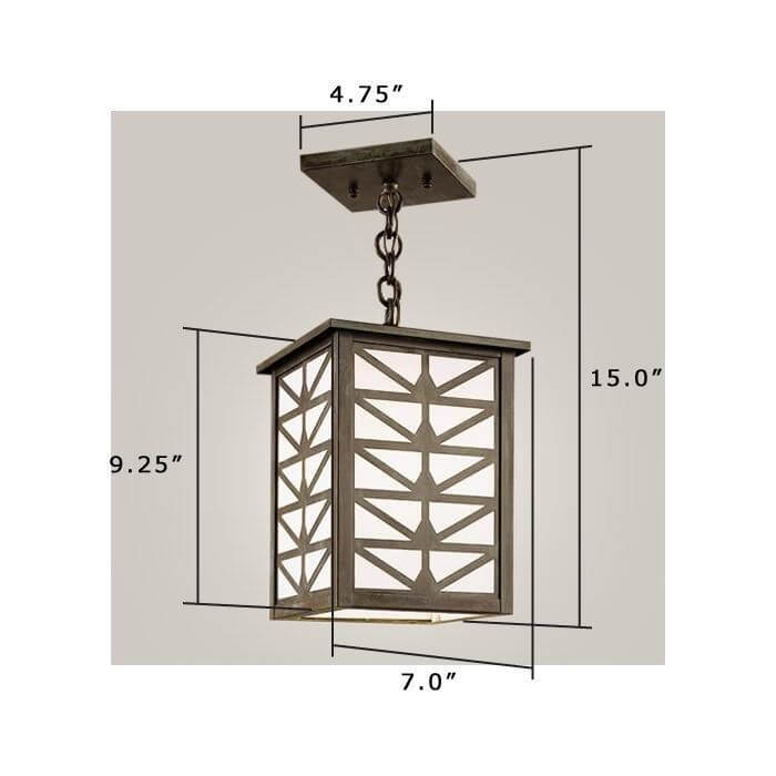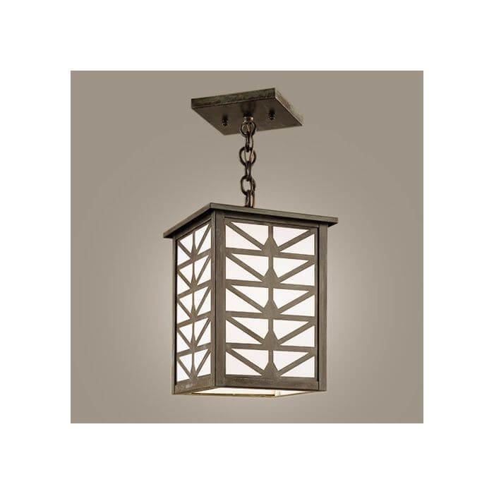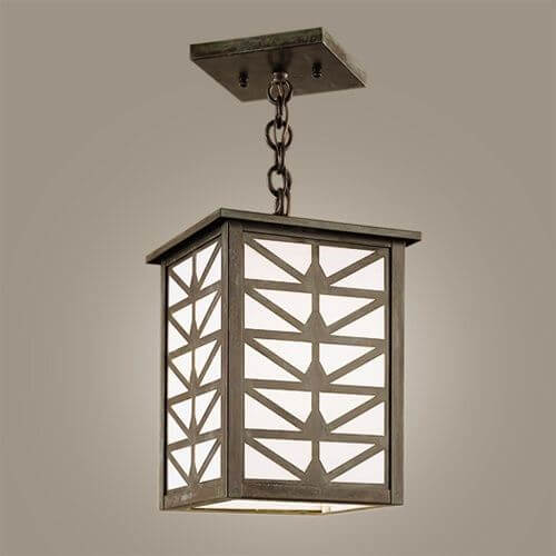 Shown above is our handcrafted Sunrise Center Lantern 7 inch Wide Chain Hung Interior/Exterior Pendant Light in authentic Verdigris metal finish with clean White Opal art glass panels. The made in Milwaukee chain mounted lantern is Prairie Style inspired and features a stylized sunrise motif decorative Overlay over art glass panels. This indoor or outdoor ceiling light is available in 6 high quality metal finishes and with 9 creative art glass panel choices. Order the solid brass lantern in the best Overall Length for your ceiling height. Over the years, our customers have ordered the handsome lantern for front porches, front entries, foyers, stairwells, hallways, recreation rooms, home bars, and sunrooms. If you have questions regarding the best Overall Length for your Sunrise Center Lantern, please contact our sales team for helpful lighting design tips.