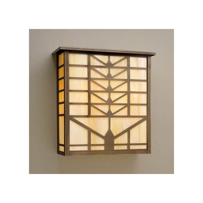 Prairie School architects often created elaborate designs for stained glass windows and light fixtures inspired by forms in nature. We use variations of a stylized sunrise pattern to create handsome wall mounted lanterns suitable for a variety of indoor locations. Shown above is our handcrafted made in Milwaukee Sunrise Center Lantern 18 inch Wide Flush Interior Exterior Wall Light with Roof in elegant Satin Antique Brass metal finish and warm Gold White Iridescent art glass panels. Customers have ordered these charismatic solid brass Prairie Style indoor/outdoor light fixtures for modern rustic homes and cabins, Craftsman Bungalows, Frank Lloyd Wright influenced residences, and to enliven commercial projects that require compact fluorescent lighting. The slim profile makes this lantern sconce a good fit for vestibules, hallways and corridors, powder rooms, mud rooms, recreation and family rooms, stairwells, and any location that needs interesting, high quality decorative lighting with exceptional illumination. Our made-to-order Prairie Sunrise Lantern Sconces are available in three sizes. If you have questions regarding the best scale all lantern for your project, please contact our sales team for helpful lighting tips.