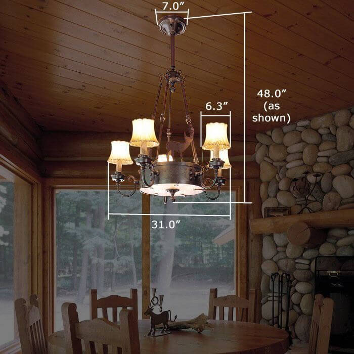 The charming dining room of a log cabin home is pleasantly lit with our Sutter Five Light Curved Arm Chandelier with electric candles. Mounted to the stained pine board ceiling, the handcrafted made in Milwaukee rustic chandelier features a hand bent circular ring with etched leaf and vine pattern, five arms with hand crimped bobeches and metal rivets, and highly detailed pinecone finials. Shown in rich Architectural Bronze finish with a Natural Shale Mica bottom panel and handmade sheepskin shades, the Sutter Five Light Curved Arm Chandelier is a truly distinctive fixture that displays rare craftsmanship and skill ““ just as the custom built fieldstone fireplace with peeled log mantel does. The Sutter Chandelier shown was ordered with the Timberline Option: metal silhouette figures of deer. For a less whimsical look, order your Sutter Chandelier without the Timberline Option. Please contact our sales team for determining the best Overall Length based on your room size and ceiling height.