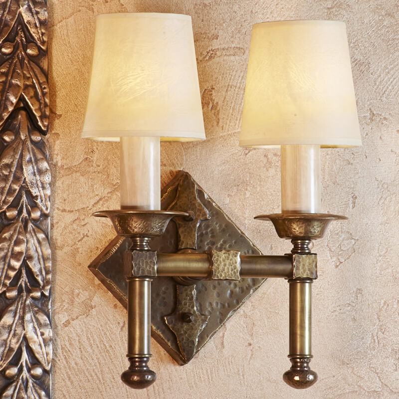 The English Arts & Crafts influenced Sutton™ Hand Hammered Two Light Straight Arm Sconce with electric candles pictured was custom designed for the master bathroom of a circa 1920‘s Tudor Revival Style home. Distressed Brass metal finish is the appropriate choice for the period of the home and style of the sconce. The wall light was handcrafted in our Milwaukee, Wisconsin plant and features hand hammering on the diamond shaped backplate with double arrows, cube details, and bobeche candle cups. The hand hammer texture complements the rough surface of the plaster wall as well as the design on the gilded plaster frame around the mirror. Now a standard fixture, the Hand Hammered Two Light Straight Arm Sconce with electric candles works well in Tudor, Rustic, and English Arts & Crafts Style rooms. This light fixture is available in any our 13 high quality metal finishes and with your choice of paper, bark, silk, or sheepskin shades from our exclusive selection.