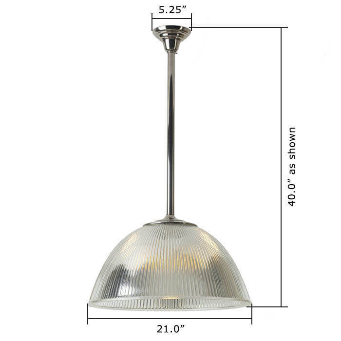 The simple reproduction bell style canopy complements the sleek curved shape of the original prismatic Holophane shade. The bright Polished Nickel finish carries this vintage original ribbed prismatic pendant light into a modern aesthetic.