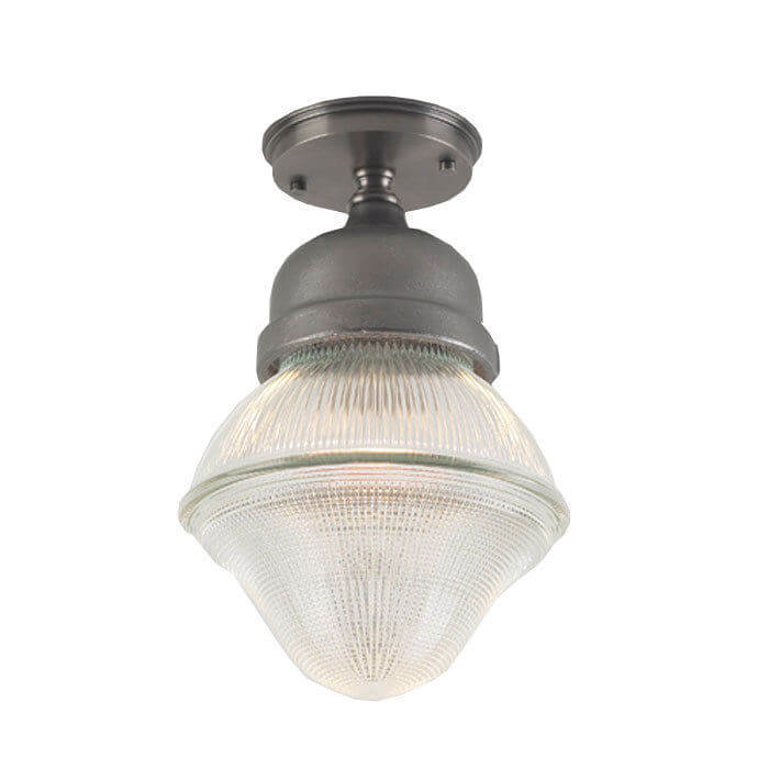 The bold steel fittings and intricately patterned acorn globe marry a strong industrial look with a touch of whimsy. The short overall drop allows for a wide variety of applications for this vintage original antique Holophane prismatic globe.