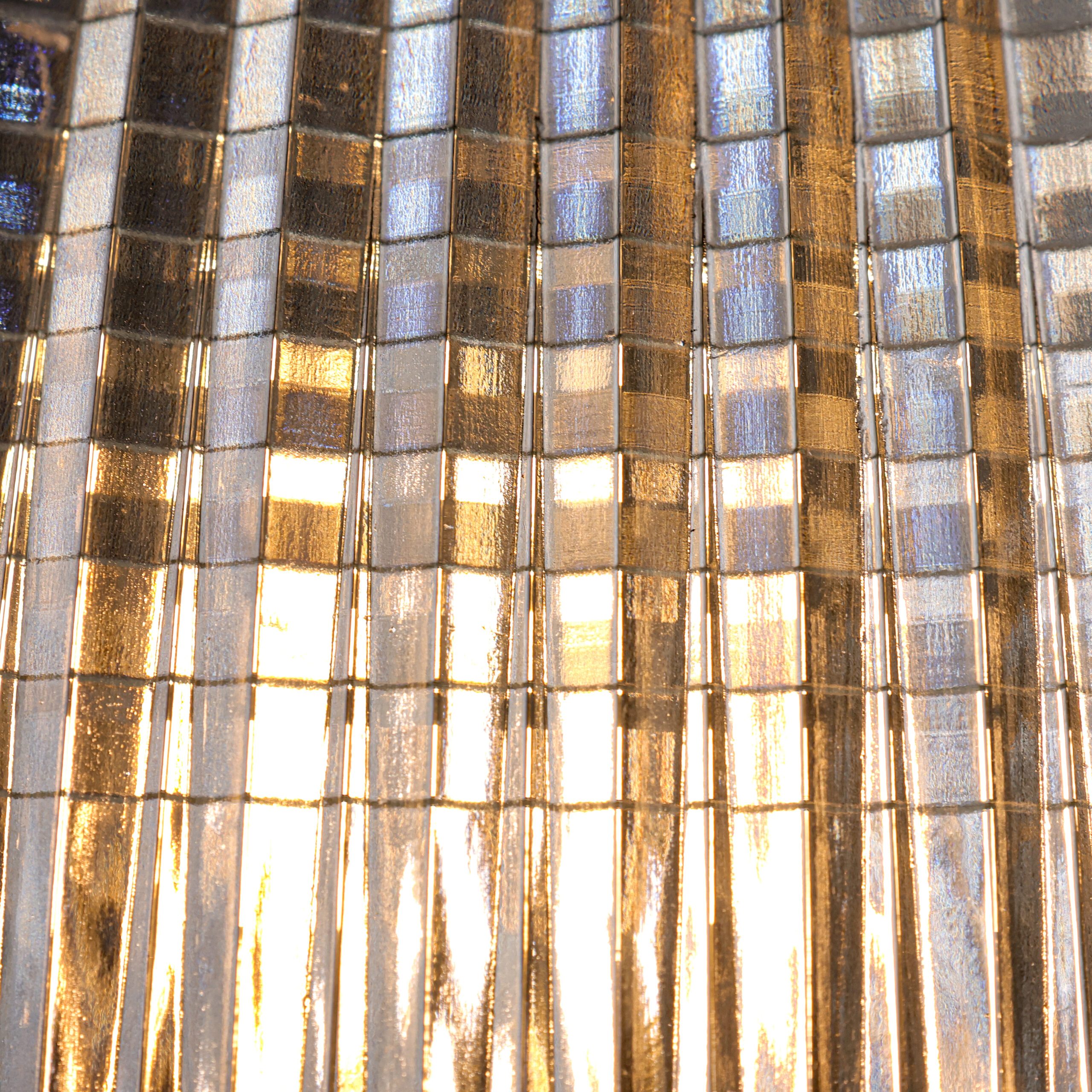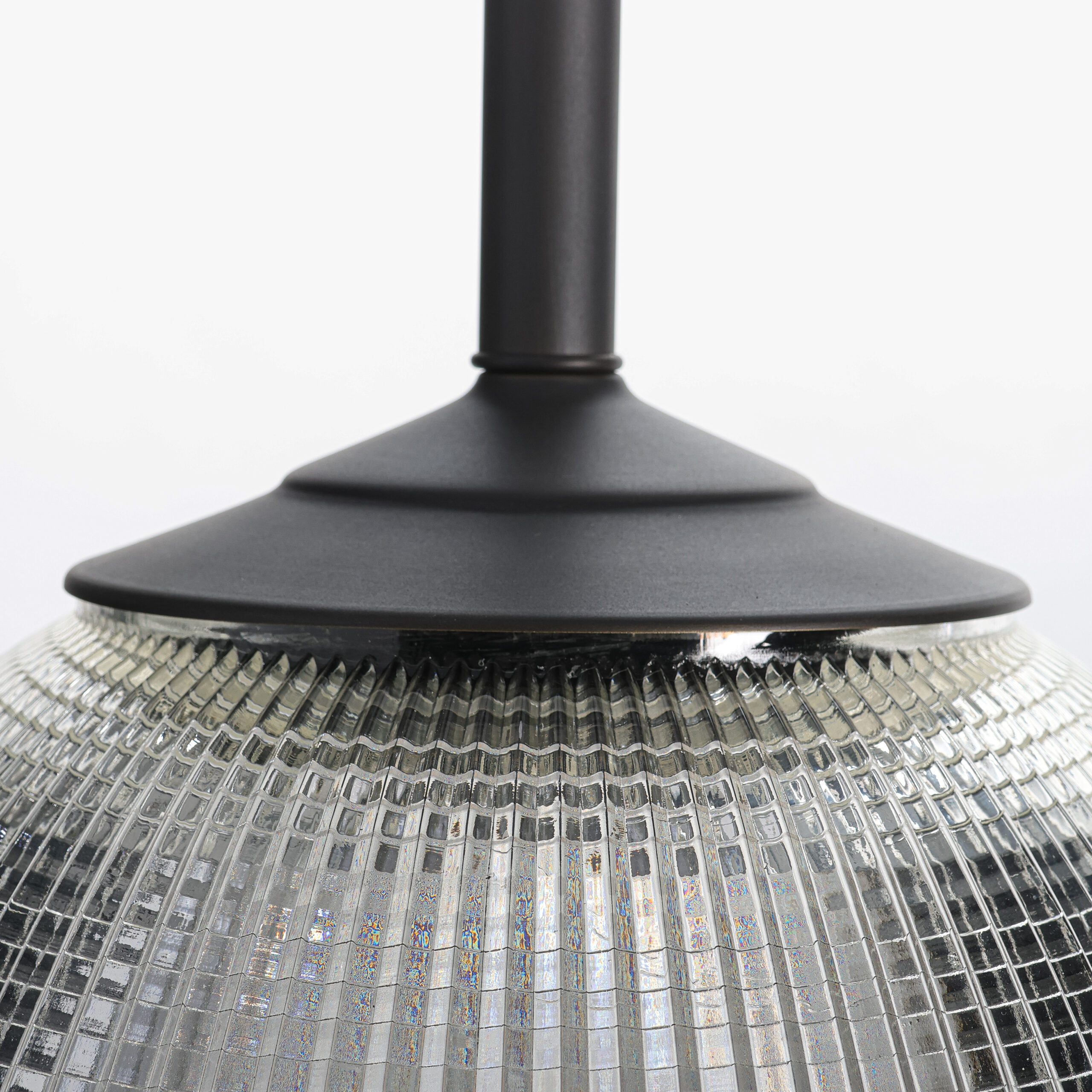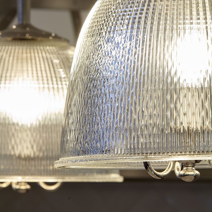 Simple reproduction style pendant hardware in a soft Brushed Nickel finish allows the intricate, sparkling patterns of the antique prismatic Holophane glass shade to shine. The thousands of intricate ribs and facets produce a shimmering effect, adding an alluring glow to any room setting.