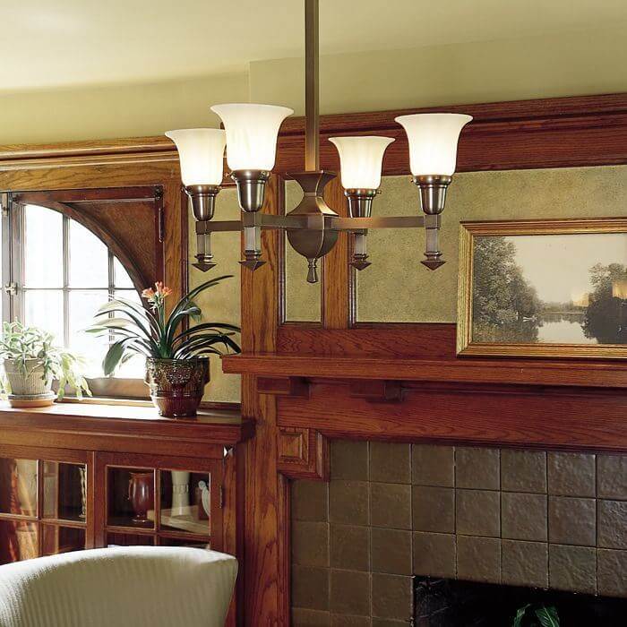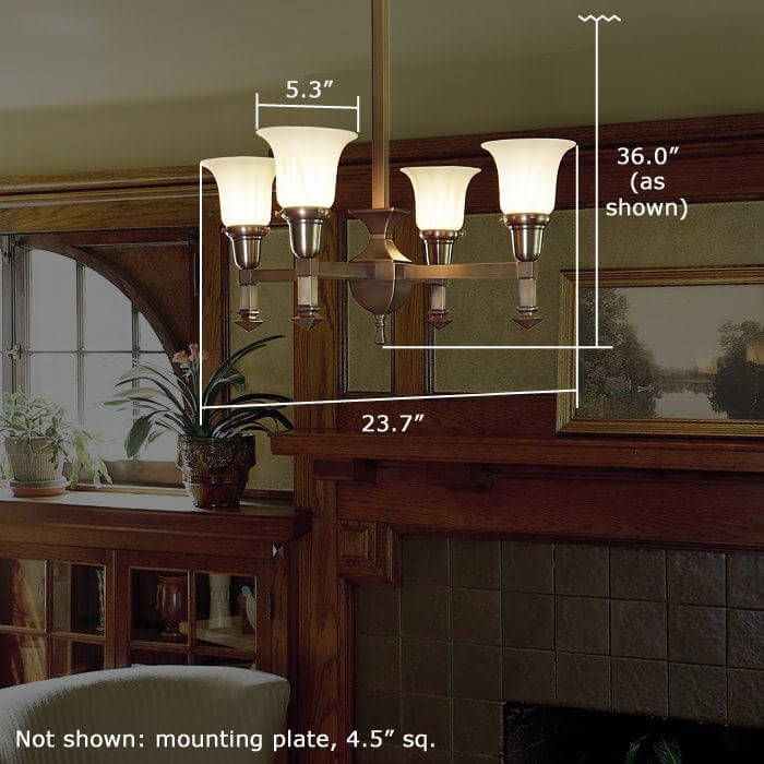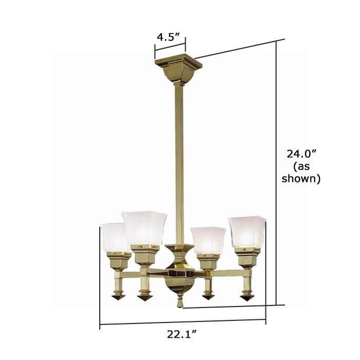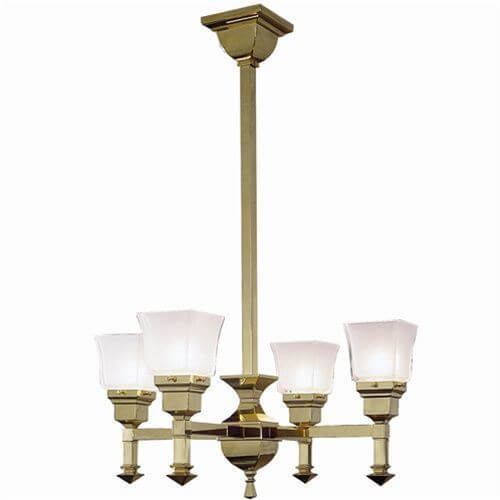 Our English Arts & Crafts inspired Wentworth Four Light Chandelier with 2-1/4″ shade holders is a fantastic chandelier for classic interior styles such as Arts & Crafts, Mission Revival, American Craftsman, Transitional, Traditional, Tudor Revival, and Bungalow. Featuring straightforward design with square components and turn of the century English style finials, the chandelier is also striking in contemporary finishes like Polished Nickel and Brushed Nickel. The made in Milwaukee Four Light Chandelier is a popular choice for comfortable bedrooms, cozy family rooms, and period dining and living rooms. Shown in warm Polished Brass metal finish, the Wentworth Chandelier is available in 13 high quality metal finish options and with your choice of glass shade. Specify the made-to-order light fixture in the best Overall Length for your ceiling height. For assistance choosing the best metal finish, Overall Length, and shades for your ceiling light; please contact our sales team for helpful lighting design ideas and tips.