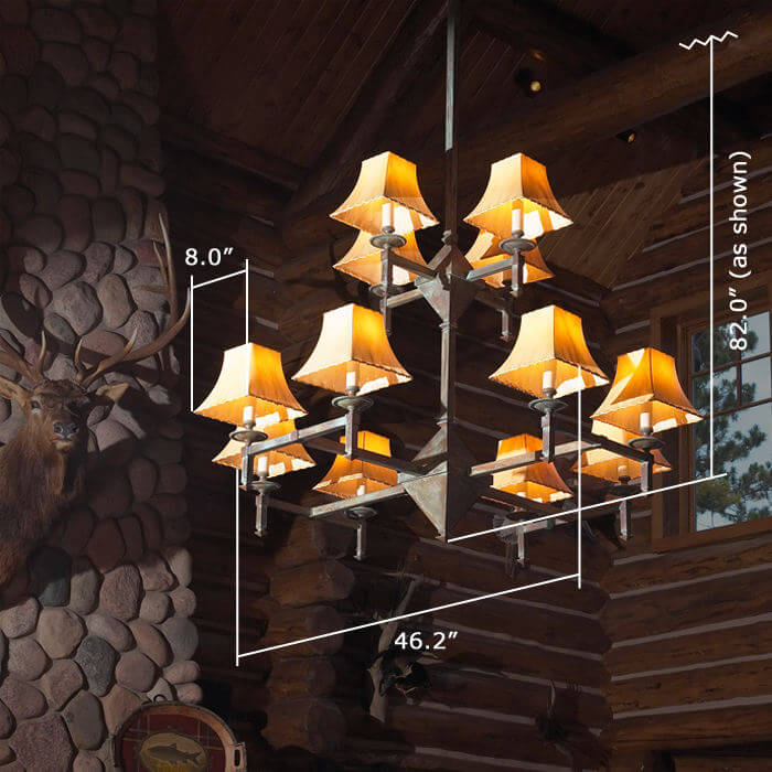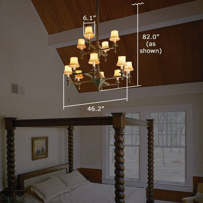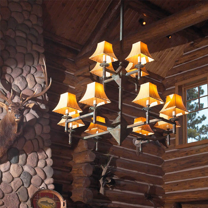The Wentworth™ Twelve Light Large Two Tier Chandelier was chosen for this spacious bedroom with tall ceilings for both its scale and plentiful illumination. Shown in authentic Verdigris Patina with natural Sheepskin Shades, the large scale chandelier is a rustically elegant focal point in the austere master bedroom.